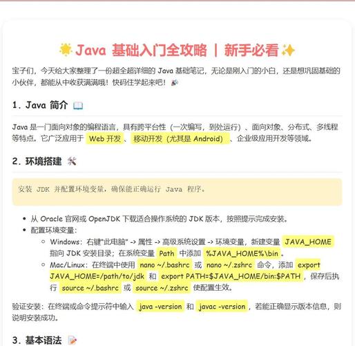 以下是“Java编程软件下载安装全教程(男人版)”的简洁介绍: 想搞Java开发?先搞定环境!1. **下载JDK**:搜“Oracle JDK”进官网,选最新版(认准Windows/macOS),勾选同意协议后下载.exe/.dmg。2. **安装**:双击安装包,路径别改默认(省事),狂点“下一步”完事。3. **配置环境变量**:右键“此电脑”→属性→高级系统设置→环境变量,系统变量里新建`JAVA_HOME`(填JDK路径),再编辑`Path`加上`%JAVA_HOME%\bin`。4. **验证**:打开cmd输入`java -version`,蹦出版本号就算成了。5. **IDE推荐**:直接下IntelliJ IDEA社区版,解压即用。搞定,开干!
