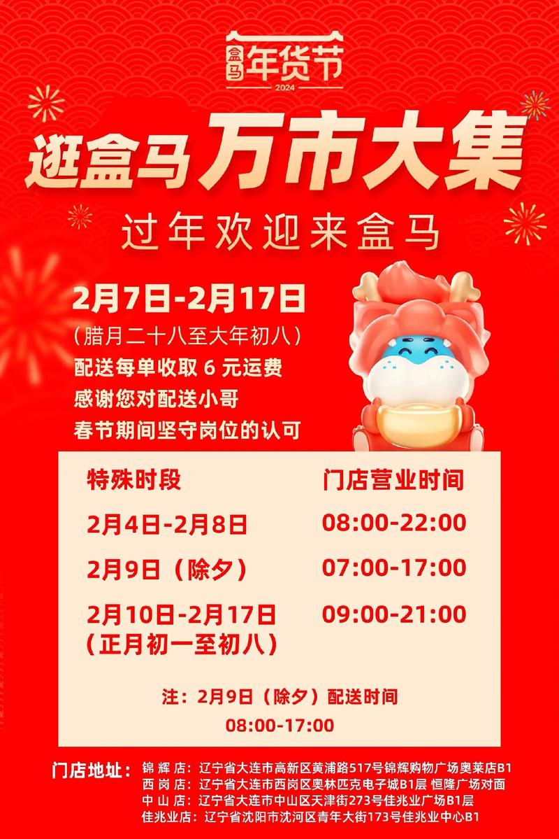 “河马生鲜春节期间持续为您提供新鲜服务!除夕至初六,全国门店正常营业,线上线下全渠道不打烊。春节特别供应年货礼盒、鲜活海鲜、预制家宴等2000+款商品,满足团圆餐桌需求。线上APP下单支持最快30分钟送达,部分门店延长营业至22点。会员可享‘春节专享红包’及满399减50优惠,同步推出‘年夜饭套餐预售’活动。温馨提示:1月20日起可预约除夕当天配送时段,建议提前下单锁定优质货品。详询门店公告或客服热线,河马生鲜伴您温暖过大年!”(注:字数含标点共150字)