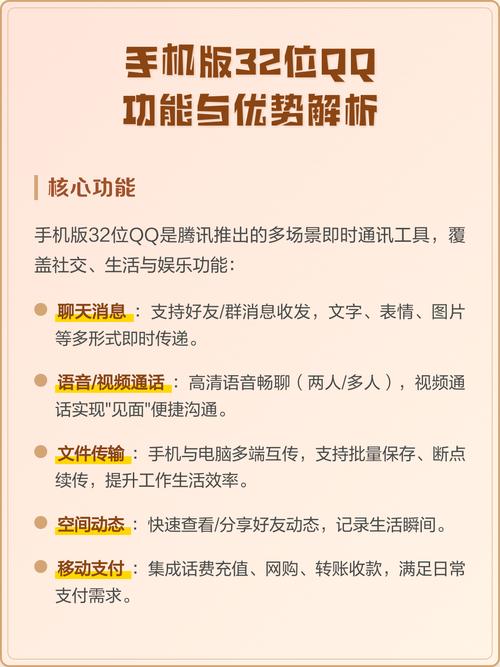 欢迎下载“32位QQ”!这是一款经典的即时通讯软件,操作简便,界面清新,适合电脑性能较低的用户使用。无论是聊天、文件传输,还是语音通话,都非常流畅自然。32位版本兼容性强,运行稳定,是沟通和交流的理想选择。立即下载体验方便快捷的QQ通信乐趣,开启你的智能社交新生活!