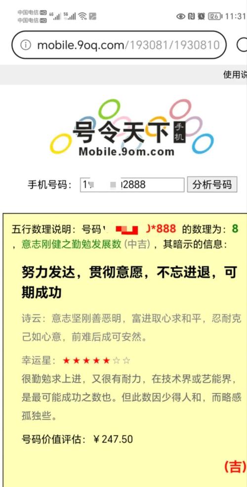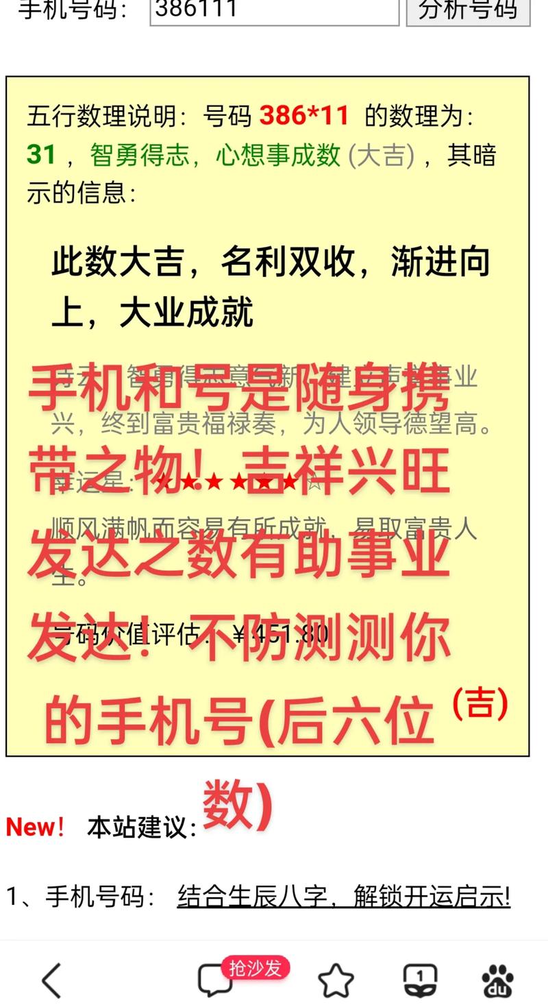 “号令天下手机号码测吉凶”是一种基于数字能量学的手机号码吉凶测试服务,通过分析号码中的数字组合、五行属性及磁场能量,评估其对使用者运势的影响。该服务通常将号码分为“吉号”或“凶号”,并结合事业、财运、健康等维度提供解析,宣称能帮助用户选择助力运势的吉祥号码。其理论依据涉及传统文化中的数理吉凶学说,但实际效果缺乏科学验证,更多作为娱乐或心理暗示工具使用。测试方式多为在线输入号码即可生成报告,操作简单,常见于命理咨询或数字风水领域。