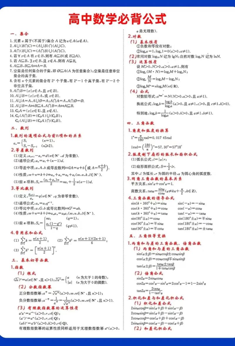 欢迎下载“高中数学公式大全 完整版”!这份资料涵盖了高中阶段所有常用数学公式,内容丰富、整理清晰,适合学生巩固知识和复习备考。无论是代数、几何、三角函数还是概率与统计,都能在这里找到详细的公式和解题技巧。方便快捷的掌握数学核心知识,提高学习效率。快来下载,助你轻松应对各类数学考试!
