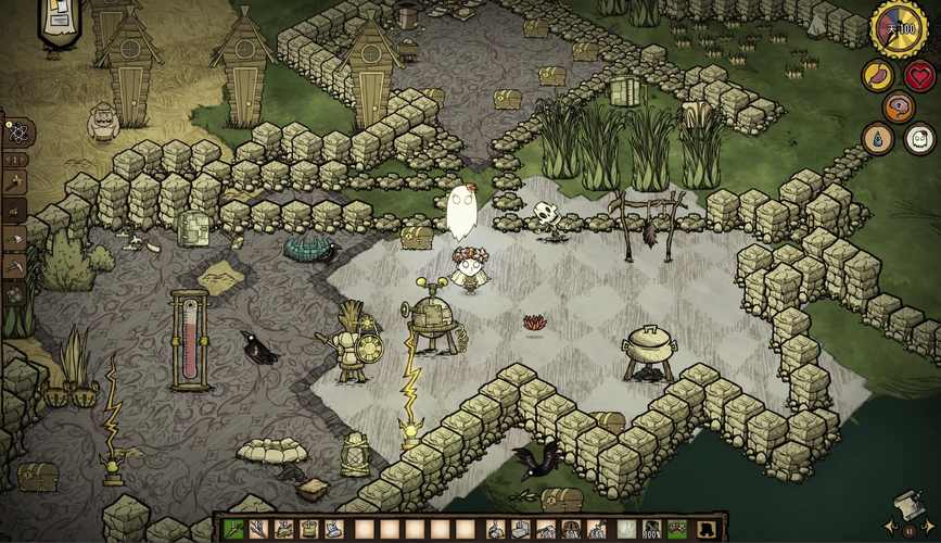 《饥荒》是一款生存类游戏,玩家需要在一个荒凉的岛屿上生存下去。玩家需要探索环境,收集资源,建造设施,种植食物,制作工具和武器,并与岛上的怪物和野生动物战斗。玩家需要小心管理自己的健康、饥饿和理智值,以避免在恶劣的环境中死亡。游戏中还有各种谜题和挑战等待玩家解决。通过不断的探索和建设,玩家可以逐渐解锁更多的资源和内容,提高自己在这个残酷世界中生存的能力。